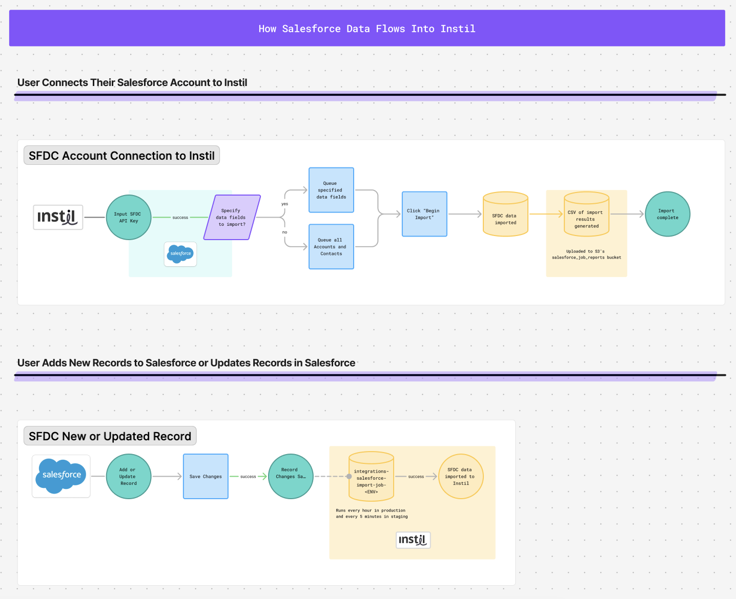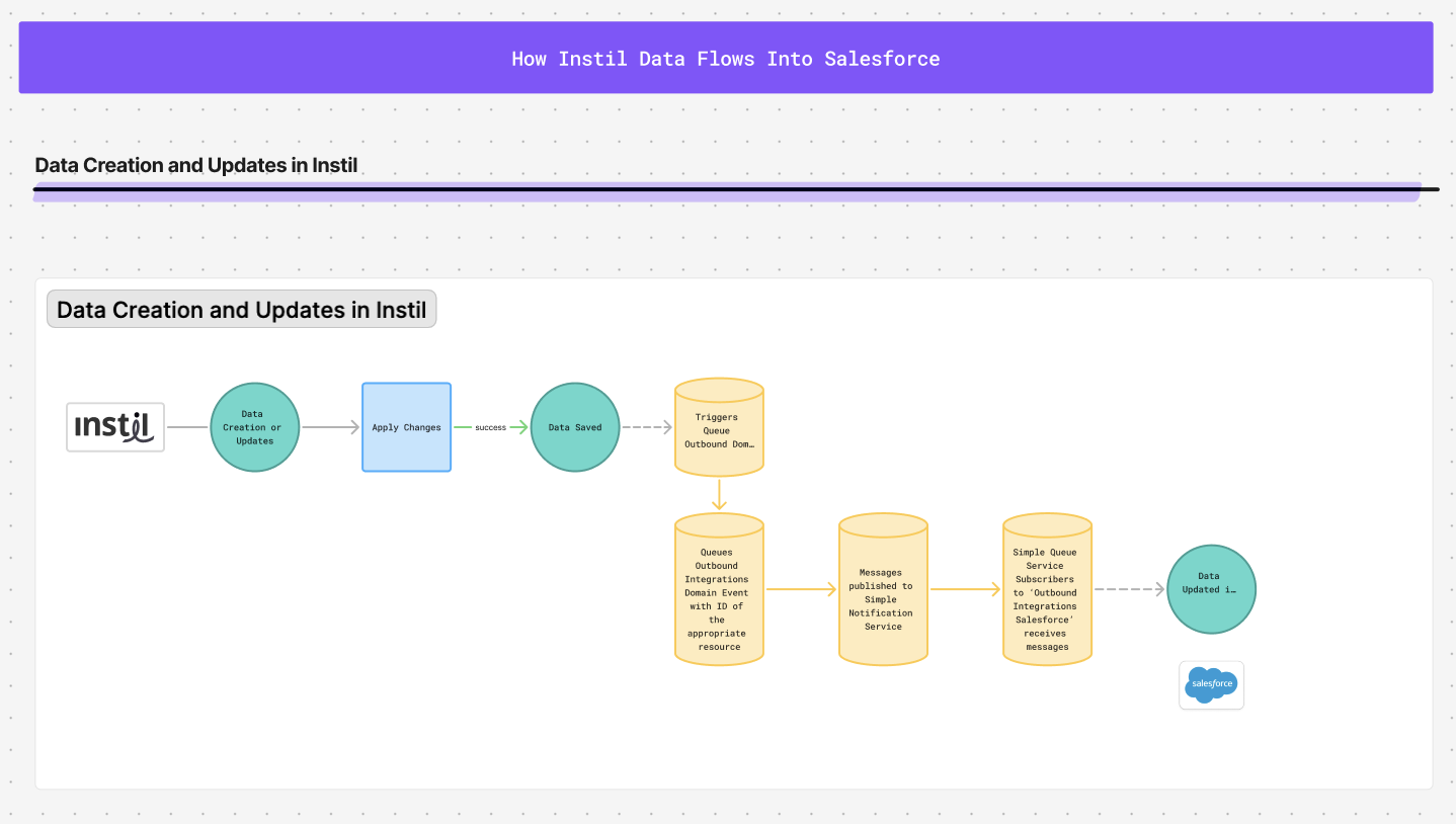 I mapped out how the Salesforce integration works for internal documentation. These assets were then used within our internal engineering knowledge base and stylized versions were used within other company documentation.
