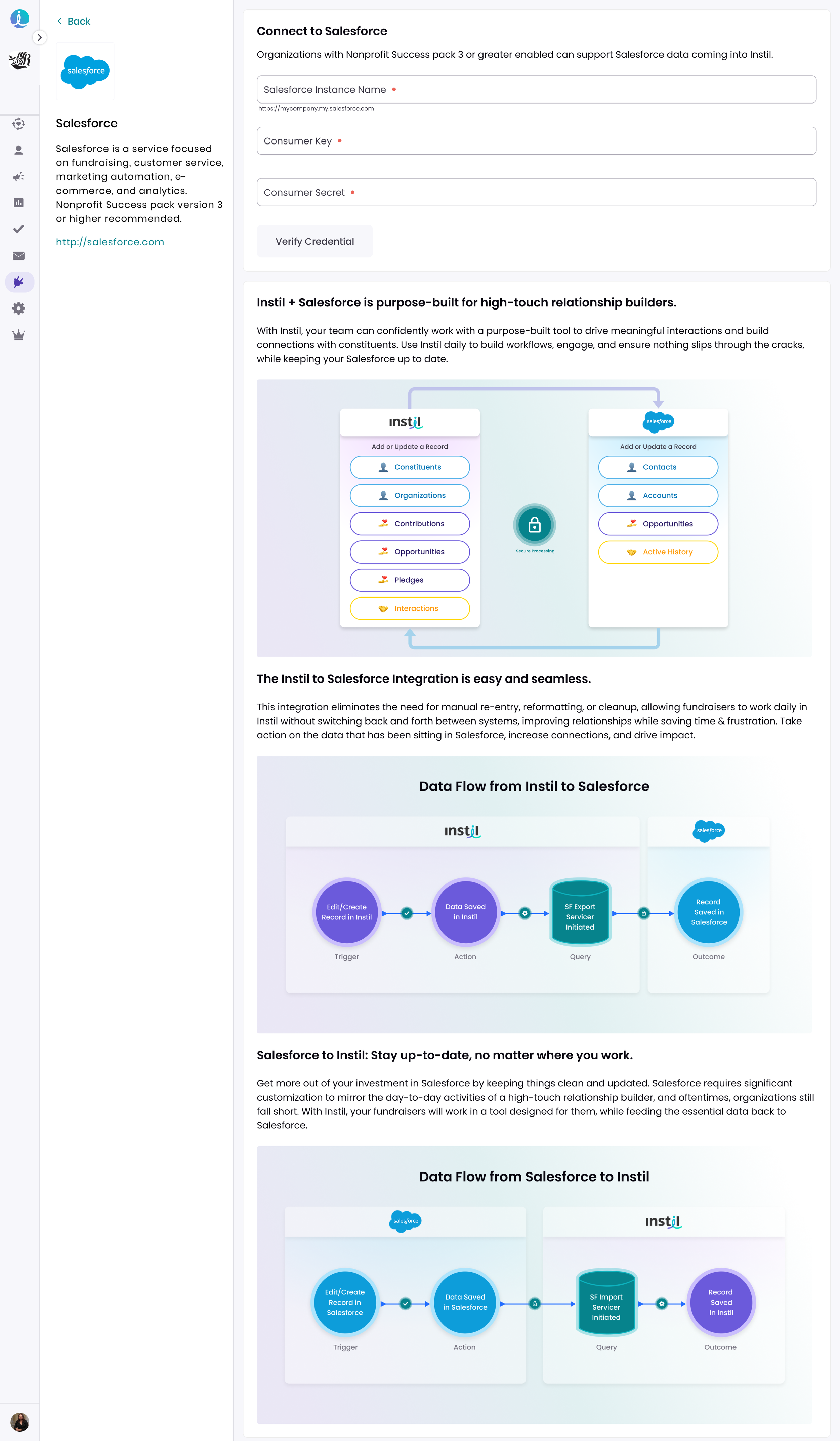 Integrating with Salesforce allowed for enriched constituent data as well as a method to help Enterprise companies begin to depricate their usage of Salesforce and fully pivot into using Instil as their only constituent management platform.
